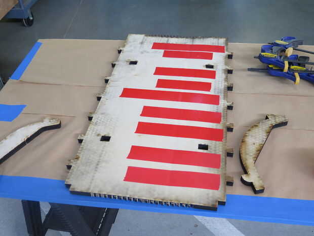 Cuando doblada la pieza, tengo un pliegue a lo largo de uno de los cortes, pero no un descanso completo. La cinta que ve en las fotos estaba destinada a mantener el pliegue de la división de sujeción y pegado de la pieza kerfed para las cerchas.