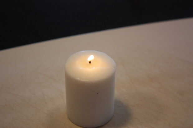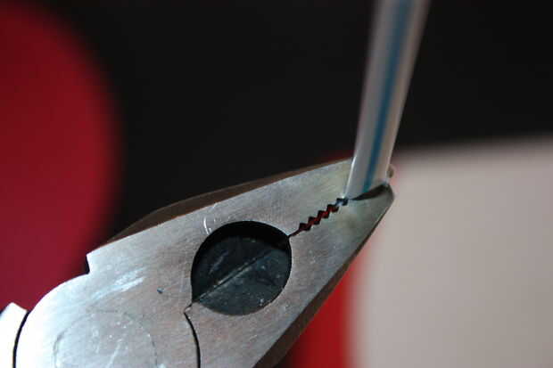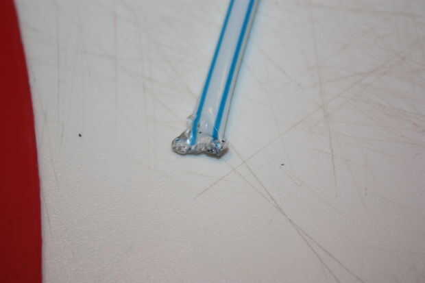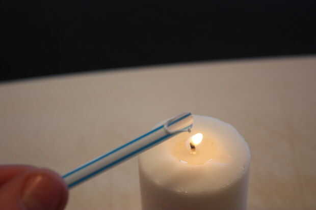 Encender la vela y poner la paja encima para que se funda un poco. Tome las pinzas y apriete la parte fundida de la paja.