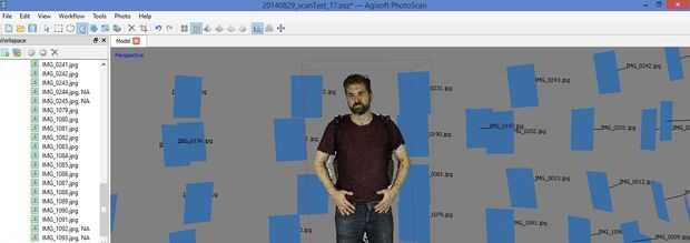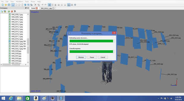 Cuando la cámara se alinearon crean una nube de puntos dispersos. Si la nube de puntos dispersos se ve bien, se genera una nube de puntos denso. Primero seleccione rotar alrededor de la nube de puntos dispersos a comprobar. A continuación, seleccione el icono de rotación cuadro delimitador. Rotar el rectángulo de manera que quede alineado con el modelo, luego seleccione el icono de tamaño de caja consolidado y conforman el cuadro delimitador hasta que se ajuste a la vuelta de la materia. Una vez que terminado seleccione crear densa nube bajo la ficha de menú de flujo de trabajo cambie la configuración de densa nube debajo de General a calidad: medio y avanzado para filtrado de profundidad: agresivo y pulse OK.