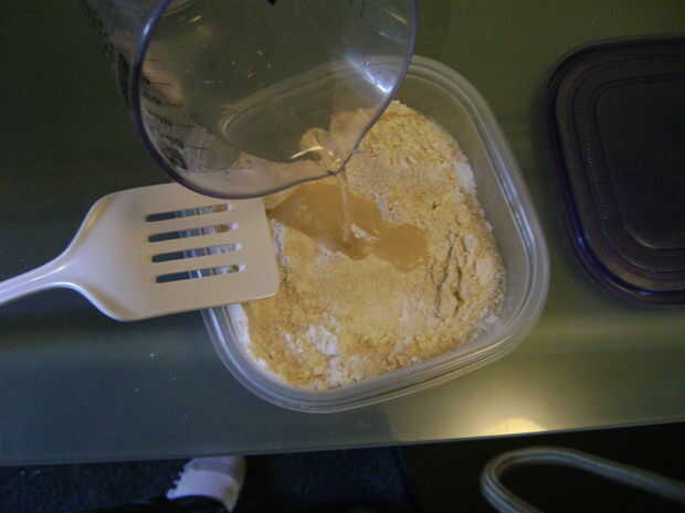 Ellos despiertan. El agua y la harina forman una bola gruesa, pegajosa. Tratar de que todos los de la harina allí. No te preocupes que se adhiera a las paredes. Se va a pegar a todo.