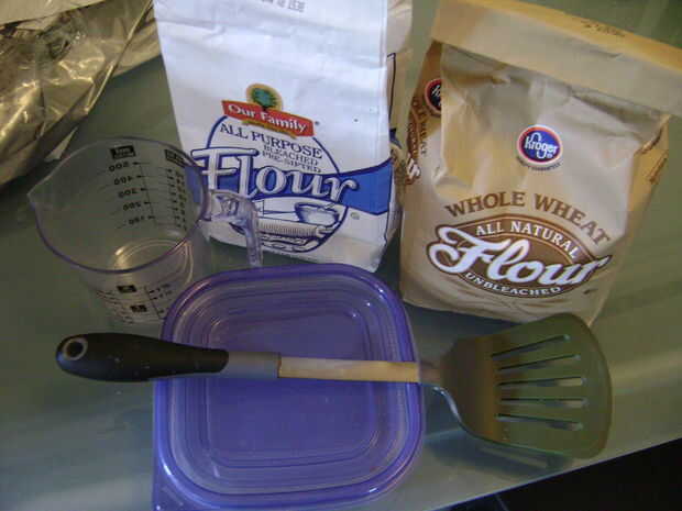 Poner 1 / 4c (taza) cada de las harinas blancas y el trigo en su contenedor. Es flour.* total de 1 / 2c