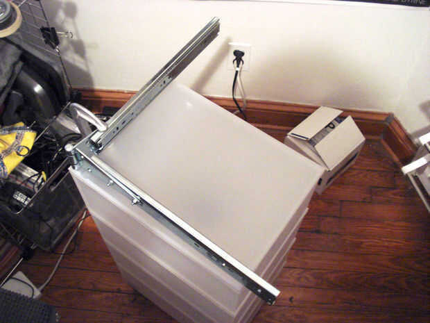 Deslice los extremos de los corredores del cajón unas cuantas pulgadas por lo que puede conectar las cámaras a ellos. Abra los clips en la parte inferior de las cámaras y presionar sobre los bordes superiores de la gaveta.