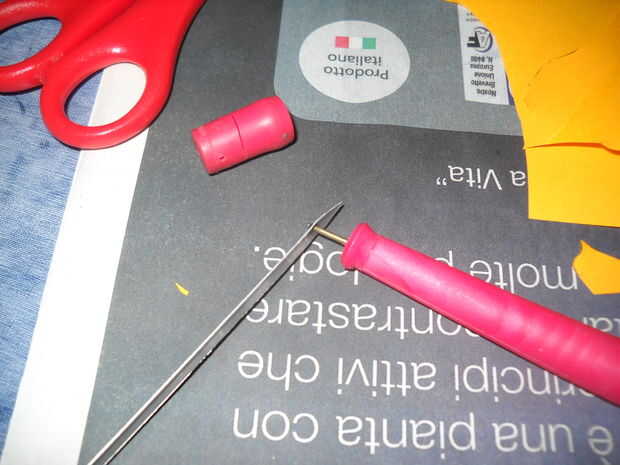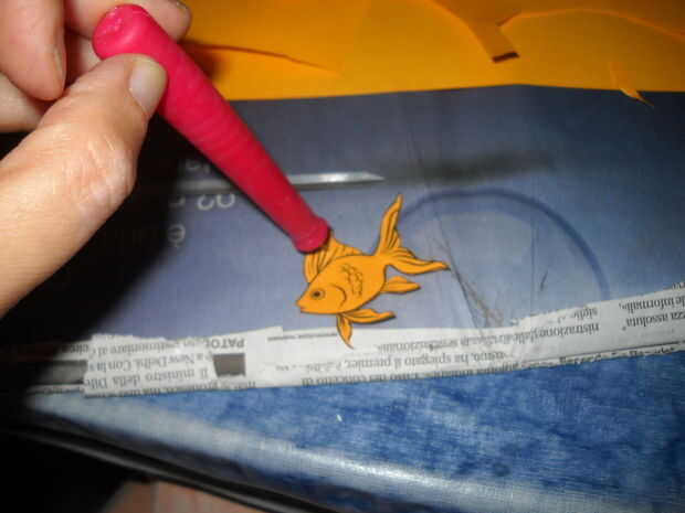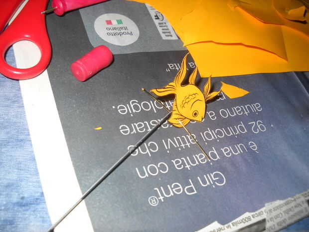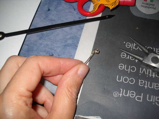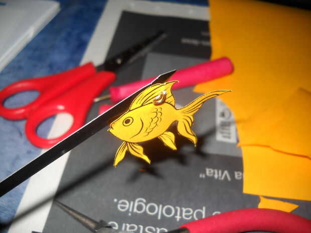 Con el punzón haga un agujero en la aleta dorsal de los peces y en la manecilla de los minutos. Enrosque el alambre de metal a través de la mano y los peces. El pescado debe colgar tranquila libre de la mano. Este camino va a ser siempre como la mano rota.