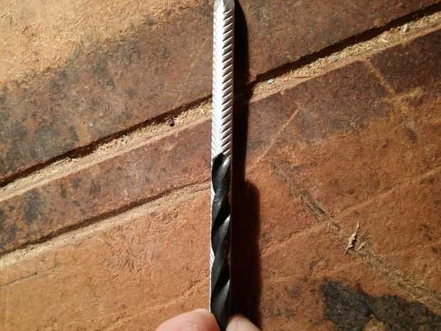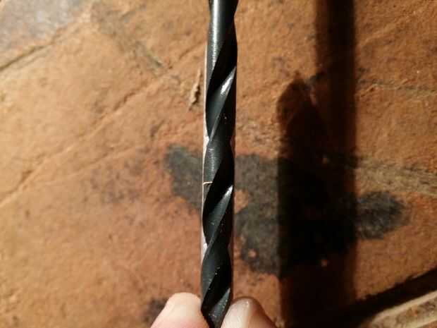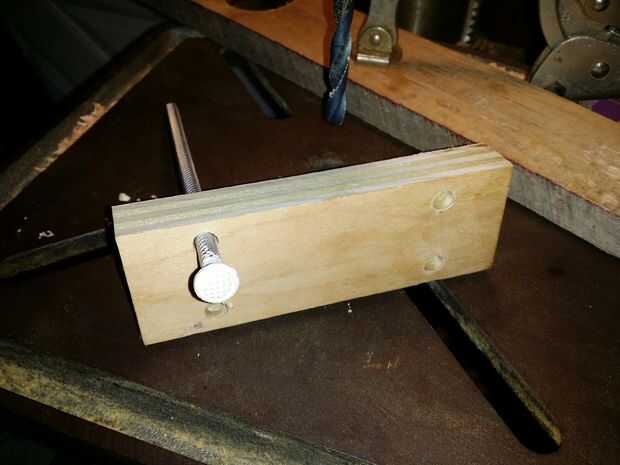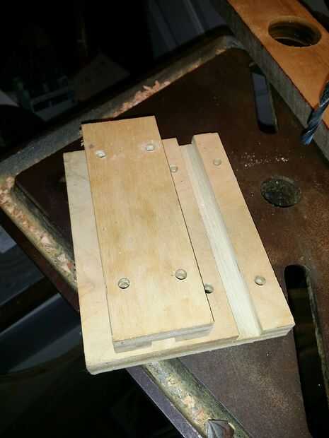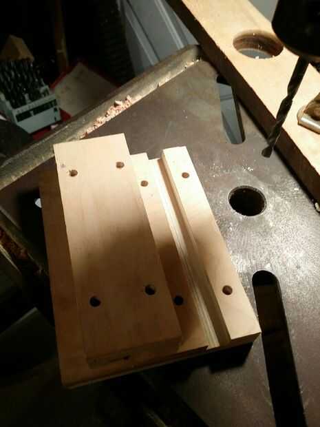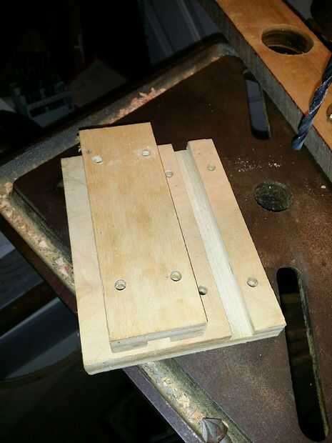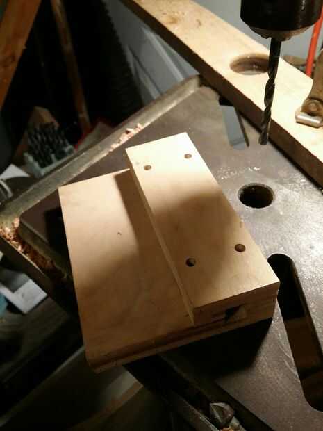 Una vez que se establecieron los centros de agujero hacia fuera la parte superior e inferior se sujetaron juntos y perforados en el mismo tiempo en la prensa del taladro. Los dos perforación de al mismo tiempo tiene la ventaja de (esperemos) mantener la alineación entre ellas las mismas y utilizando el taladro da un mejor les dispararon ser todos el mismo ángulo a través de los objetos. Perforar un agujero más pequeño que el diámetro de la espiga a través de ambas piezas y volví y había perforado de agujeros para los clavos en la pieza superior. Los agujeros están en la misma ubicación que los primeros cuatro agujeros más pequeños en la parte superior, para que permita que el centro de sí mismo en los agujeros originales y el el resto del camino a través. De esta manera el punto todavía tiene material para sujetar en la parte inferior y los agujeros superiores son lo suficientemente grandes para dejar la parte superior mover arriba y abajo y en teoría toda línea de cuatro para arriba.