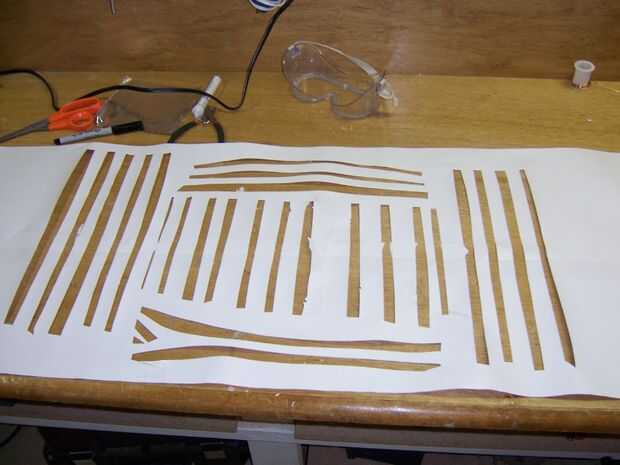 con su cuchillo de la manía, corte tiras de una de las hojas de papel. Asegúrese de que cada tira es de menos de 1 cm de ancho o te toparás con problemas más adelante. No importa el diseño de los cortes.