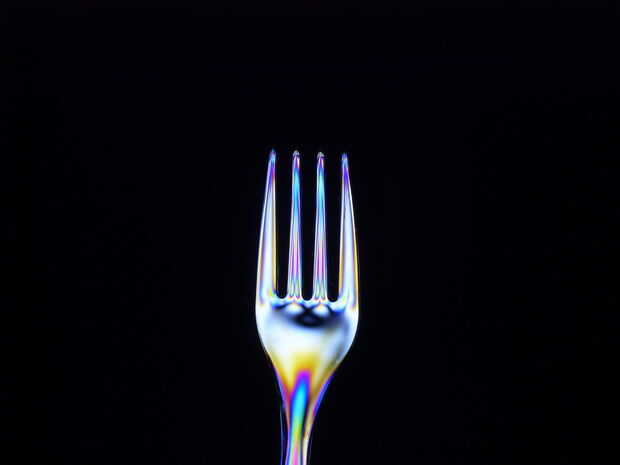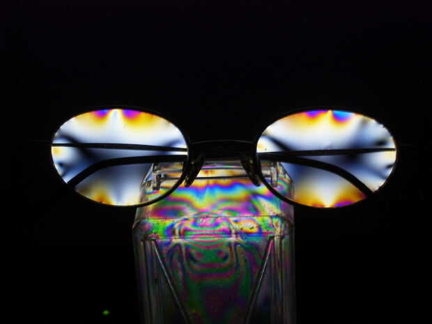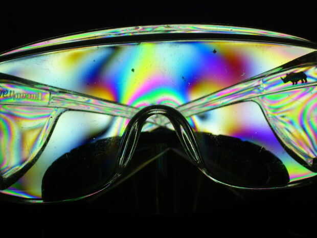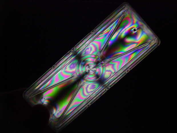 Cuando inserta un elemento de plástico duro en el campo entre el portátil y la cámara, la propiedad birrefringente de las causas de plástico ángulo de la luz de polarización para cambiar, ya que nuestra luz no es "Cruz polarizado" llega a ser visible otra vez a la cámara. Y puesto que las diferentes longitudes de onda tienen diferentes índices de refracción la luz visible aparece como un arco iris de colores. Exposiciones son del orden de 1/2 segundo por lo que debe usarse un soporte para sostener el objeto.