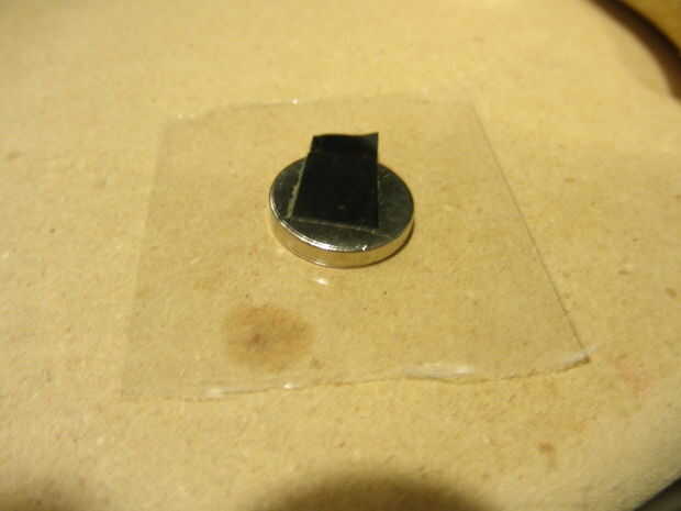 Usando el otro imán, cortarse una cuadrado/de la tira clara del plástico de la cinta del embalaje o cinta aislante y colocar el imán en el centro de la porción pegajosa con atraer cara arriba.