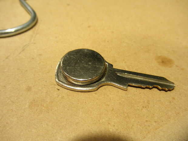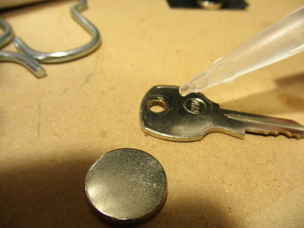 Utilizando un suave a fuerte pegamento/epoxy, significó para Unión de metal a metal, pegamento abajo el imán a la llave. Asegúrese de tener el lado atraer hasta.