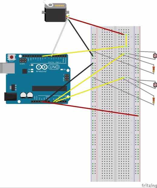 Siguiente paso es conectar el arduino, servos y sensores según el esquema mostrado en la imagen.