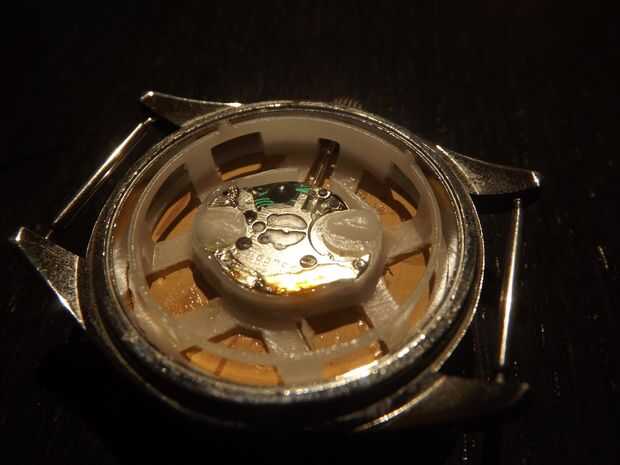 Utilizando el filo de un cuchillo o una tijera, pueden aparecer la parte de atrás del reloj. En el interior encontrará un soporte plástico para el mecanismo, así como el mecanismo sí mismo (por supuesto esto es diferente para relojes automáticos).
