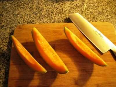 Se necesita un mínimo de 9 gajos, cada uno aproximadamente una pulgada de ancho. Si se corta cada mitad por la mitad (que le da los cuartos) y cada cuarto por la mitad, que te dará 8 piezas. Pele la piel!