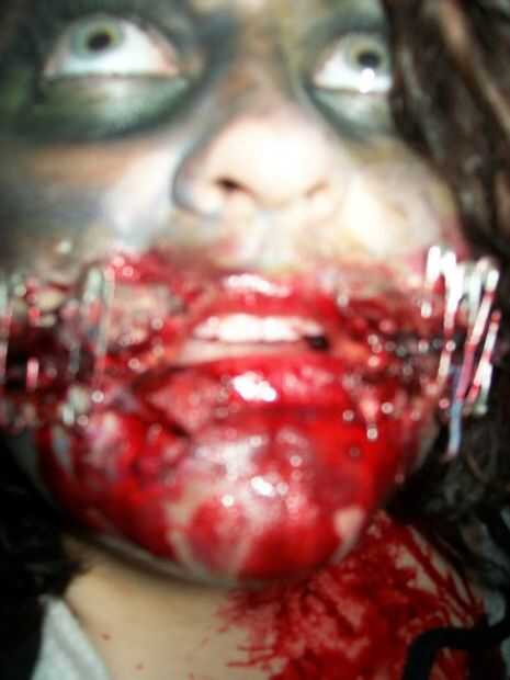 Es necesario aplicar maquillaje negro entre los dos rodillos por cada lado para que parezcan profundas. Deberá poner los pasadores de seguridad en la prótesis, asegurándose de que no a la cara del perno. Ahora necesita usar rojos y amarillos para hacer los cortes parezca realista. Utilizar marrones, amarillos, negros y verdes en varias partes de la cara para que se vea sucio y rayado encima. Aplique verdes y negros alrededor de los ojos para que parezcan hundidas en y profundo. Aplique sangre falsa en los cortes y a correr por su cara y cuello. Si es la especie comestible, poner un poco en la boca y déjela correr hacia abajo también.