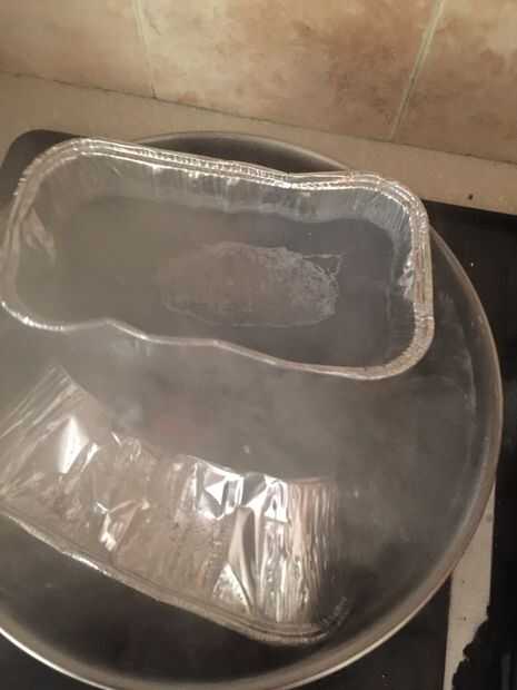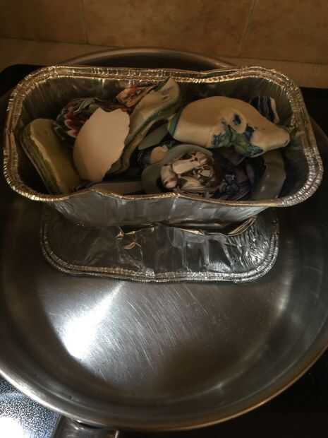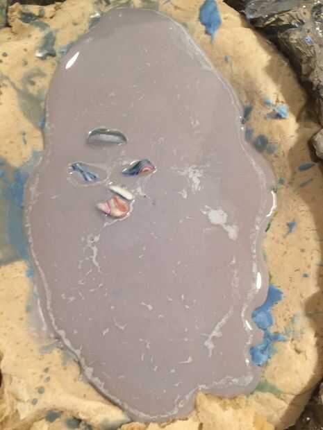 Derretir la cera en una especie de baño María (un recipiente de hoja de lata en un recipiente llenado de agua) los colores si lo deseas (si no el color final es un azul muy oscuro) y vierta la cera derretida en el molde.