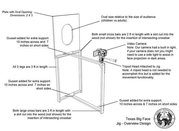 Para interactiva proyección facial, requerimos una plantilla para llevar a cabo todas las funciones arriba indicadas: control de movimiento de la cara, colocación de la cámara de control y reproducir resultados constantemente. Su jig puede parecerse a cualquier cosa. Puede ser tan simple o tan complejo como usted se sienta como lo que es. La plantilla que hemos creado es simplemente un pedestal con un agujero oval montado en un extremo y una cámara de video montada en el otro extremo. El agujero es sólo lo suficientemente grande como para un adulto promedio poner su cara, pero no lo suficientemente grande como para permitir que la cabeza pase a través.