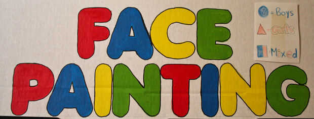 Uno de los pasos más importantes en la fabricación de una pintura de la cara tablilla es crear una representación visual de una señal de "Face Painting" para los clientes a llamar la atención sobre su talento. Mi Consejo, compré un tablero de presentación del tríptico y un paquete de cartas de tablón de anuncios de la tienda de dólar. A partir de ahí, en la parte superior, junté las palabras "Pintacaras" y pinturas rojizas, azules, amarillo y verdes alternadas para trazar las letras y color en.
