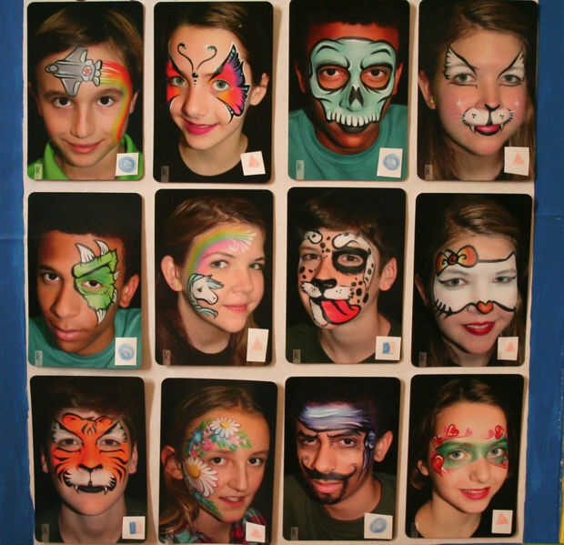 Ahora, viene la parte importante, los diseños! Para mi tablilla, que he dividido la cantidad igual de diseños en 3 secciones. La sección intermedia, como ves en la foto de arriba, contiene 12 FaceCards. Estas tarjetas han sido desarrolladas por pintor de cara Ashley Pickin, que querían llegar a una solución de pintura de la cara en el ir: tener una visual única para sus juntas y aprender nuevos diseños en un proceso paso a paso. Por supuesto, además de eso, cada diseño es estrella prorrateado basado en el nivel de dificultad (de 1 estrella significa el más fácil, 5 lo que significa el diseño más avanzado). En este ejemplo, se pueden ver varios diseños en un formato mixto de 6 colecciones de FaceCards, como un Jet (solo chicos), lindo gato (Festival rápido) y pirata (clásico).