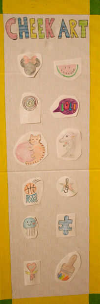 Por último, para los clientes que no son generalmente juego para un rostro completo, sino como algo un poco más pequeño, hay pequeños motivos o artes de mejilla que pueden elegir. La última sección en mi tablilla contiene precisamente eso. He utilizado lápices de colores para escribir "Mejilla arte" en la parte superior y en la imagen, sacó algunas fotos pequeñas de Artes Linda mejilla. En éste, había localizado algunos pequeños diseños inspirados en el encanto su colección, que encontré en línea. No tienes que utilizar. Siempre puede utilizar Google en búsqueda de la colección perfecta de Artes de la mejilla para añadir a su tablilla.