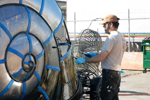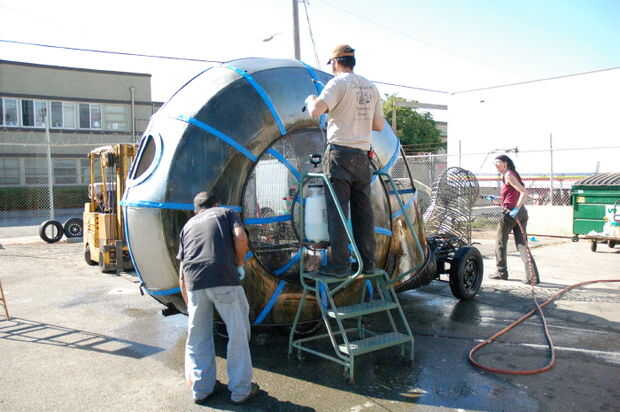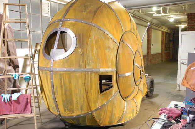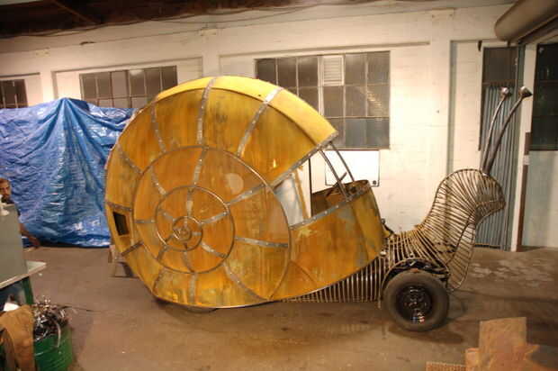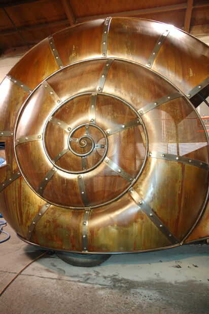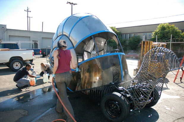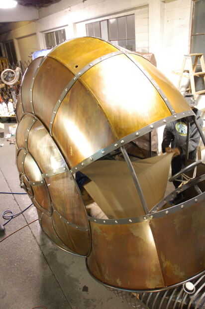 El coche se trasladó fuera y prepararon de productos químicos de la pátina. Quería una cálida atmósfera cobrizo al coche así que elegí una pátina con agua y nitrato cúprico 32-1, férrico nitrato 32-1 y pistola bluing16-1. Utilizamos pulverizadores de error para cada producto químico. Antes de aplicar los productos químicos, hemos regado el coche entero con agua. Manteniendo la sección íbamos a tratar el hombrecillo, empezamos a rociar la pistola azul, luego cúprico, y férrico. Pistola azul se usa en combinación con el cobre para rellenar puntos brillantes. Las secciones completadas se mantuvieron húmedas para mantener el aire de cambio de las secciones anteriores que habíamos terminado. Una vez el coche entero patinad, se utilizó una solución de polvo de hornear para detener la reacción, enjuaga una vez más con agua y finalmente había secado con inyectores de aire y el calor del sol. La tripulación miró fijamente lo que fue maravillosamente brillante cáscara, ahora óxido opaco de color y preguntó "por qué".