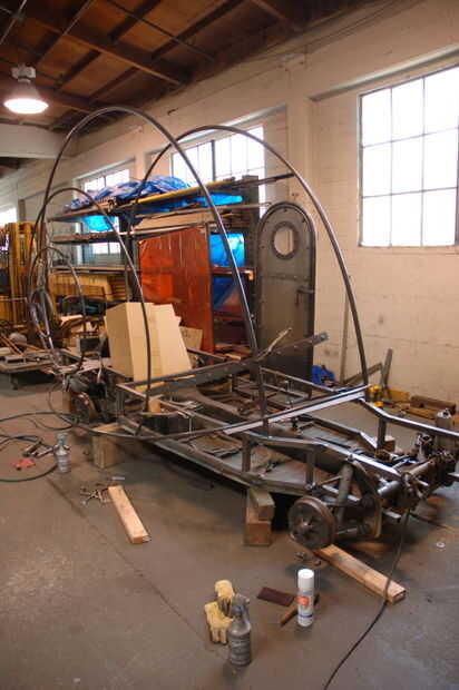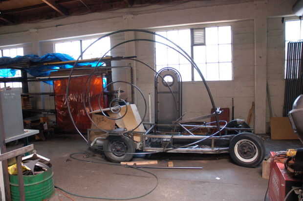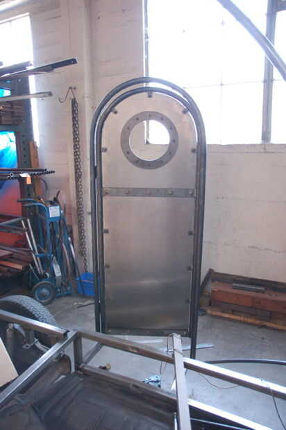 Puerta ahora es fabricada y colocada. La puerta se hace doblando dos pedazos de tubo, soldadura poco lengüetas con orificios en ellos al interior, y luego colocar un trozo de metal de hoja. El doblado dos "U" s están conectadas con 2 bisagras. La puerta se viste con un recorte del ojo de buey y 2 tiras decorativas. Con la espiral marco y puerta en su lugar que ahora podemos empezar a llenar en el metal "anillos de crecimiento" del marco, pero antes de soldar nada más necesitamos pintar el marco, bandeja, engranaje corriente y llantas.