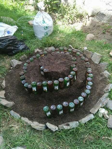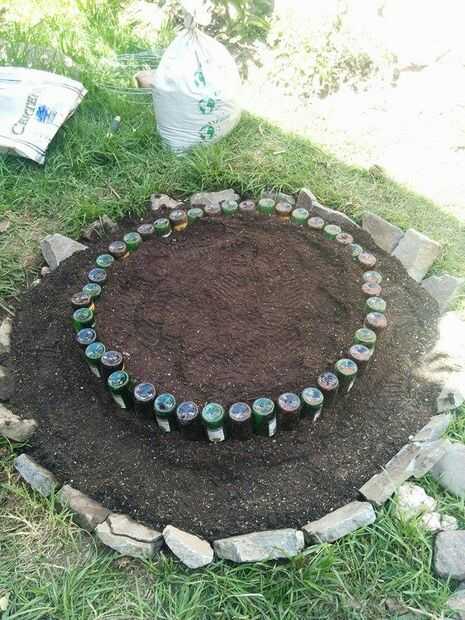 Miden 22cm del círculo externo y comenzar colocando las botellas en el círculo, una forma rápida de hacer esto se establece de la botella (cuya longitud es de 22cm) y luego empuja el cuello hasta que el cuerpo era mitad debajo de la tierra. Repetir hasta completa un círculo. Pisar con el pie al lado de las botellas, asegúrese de que el suelo es compacto. Llenar el interior del nuevo círculo con tierra hasta que alcance la parte superior de las botellas, luego pisar el suelo recién agregado, aplique agua para compactar el terreno. Con el lazo de alambre de acero el círculo de las botellas de su parte más externa, los alicates nos servirá para apretar el alambre y cortarlo.