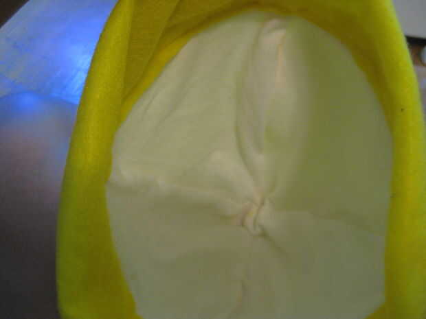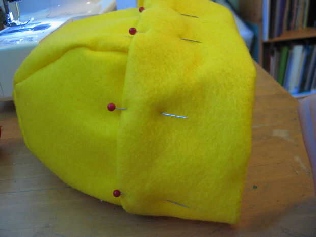 Deslice la banda inferior (lado incorrecto hacia fuera) en el sombrero (forro lado hacia fuera). Coser alrededor del borde.