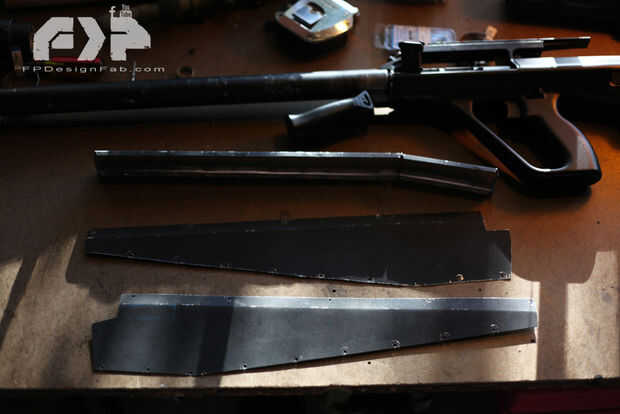 Diseñé este apoyo basado en el hecho de que estaría utilizando herramientas básicas para fabricarlo. Quería una sección de foregrip estilo recto lineal. He creado esta pieza con hoja de metal y remaches. Yo planeaba cubrir estos remaches con cintas, tiras de camo y un apretón de Palma de goma.