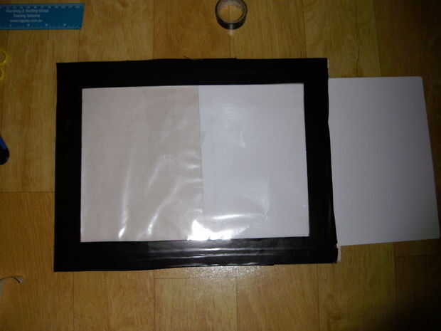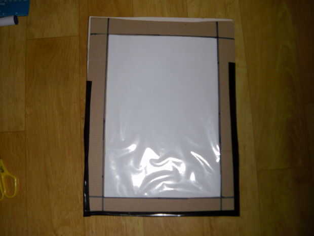 cinta la pieza posterior al cuadro, con la cinta por los lados. Antes que no tape los lados hasta la parte superior, esta voluntad aseguran que todavía puede colocar papel en la manga. la cinta no tiene que ser uniforme, que esto cubrimos hasta pronto cualquier manera (imagen 2)