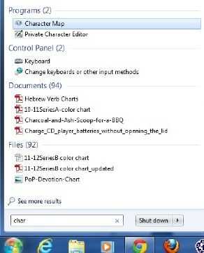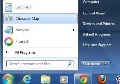 (Primer gráfico) Marcado de la manera fácil de encontrar que el mapa de caracteres de Windows 7 OS es haga clic en el botón de inicio y comience a escribir el "mapa de caracteres" en el cuadro "Buscar programas y archivos". En el gráfico se puede ver también aparece en la lista de programas usados recientemente porque abrió para la preparación de este Instructable.
