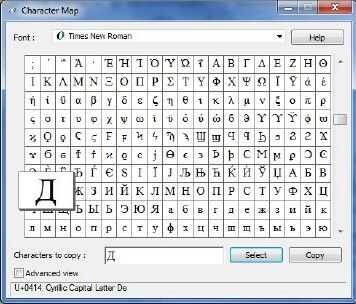 (Tercer gráfico) Este es el mapa de caracteres. Utilice el menú desplegable en la parte superior del cuadro de diálogo para seleccionar la fuente que desea utilizar. Aquí es Times New Roman. Desplácese hacia abajo de los personajes disponibles para encontrar el carácter que necesita. Haga clic en él. La carta muestra el tamaño agrandado en una caja. Algunos caracteres son similares. A Compruebe que su selección es el carácter deseado, mira en la línea de fondo en el cuadro de diálogo para el nombre del personaje. Este es el De letra mayúscula de cirílico del alfabeto ruso. Haga clic en seleccionar y luego en copia. Puede colocar más de un carácter en la ventana antes de hacer clic en el botón copiar, si necesita. Ir al documento y pegar el Portapapeles del ordenador en el documento. El mapa de caracteres contiene símbolos para un número de idiomas y alfabetos.
