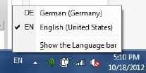 Para alternar entre las configuraciones de teclado que tienes disponible para tu ordenador, notarás las letras EN inglés en la esquina inferior derecha de la pantalla del ordenador junto a la pantalla de fecha y hora. Haga clic en él y otros teclados disponibles se enumeran en el cuadro emergente. Haga clic en el teclado que desea utilizar, si es diferente del que usas. O también puede mantener pulsada la tecla Alt izquierda y pulse la tecla de Shift del lado izquierdo. Continuación, suelte ambas teclas. Yo siempre uso el Alt + cambio de método. La derecha Alt y teclas no funcionan cuando se ejecuta este comando.