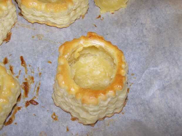 En este punto tus hojaldres poco debería estar listos para el relleno. Se dará cuenta de que la parte superior tiene este anillo. Despréndalo y tienes vasito que puede llenar para arriba.