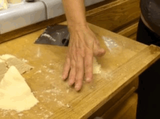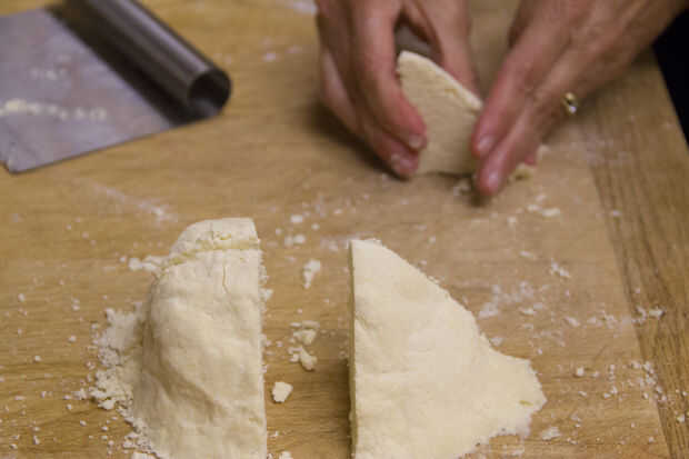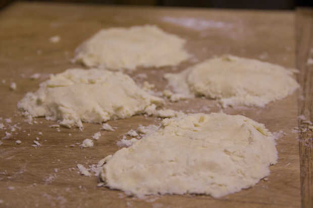 Ponga la masa sobre una superficie de trabajo y junte en un terrón. Luego dividir ese tumor en 4 trozos con un cuchillo. Para cada trimestre, borrón de transferencia hacia adelante con el talón de su mano. Este paso ayuda a distribuir uniformemente la grasa para que salga la corteza escamosa y agradable. Hacer esto con los tres trimestres restantes y luego combinan las 4 piezas.