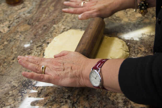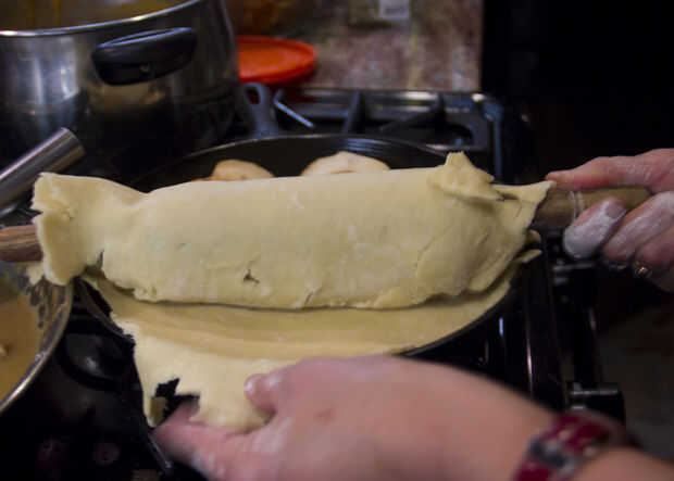 Tomar la masa de la nevera y deje que se descongele por unos 5 min el rodillo la masa sobre una superficie enharinada. Asegúrese de mantener la masa los bancos y enharinados de la superficie de trabajo según sea necesario para que la masa no se atascan. La masa enrollada hacia fuera debe ser un poco más grande que la sartén que las peras están en. Para transferir la masa de la superficie de trabajo a la bandeja, rodillo con cuidado la masa sobre el rodillo, asegurándose de que no se pegue a sí mismo.