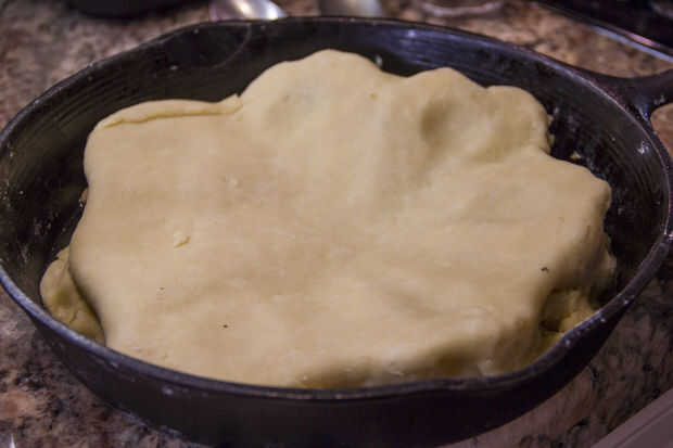 Desenrolle cuidadosamente la masa sobre la sartén con las peras. Meta los bordes de la masa en alrededor de las peras (como en la fotografía superior). Recuerde, esto va a ser la parte inferior de la tarta (como es una tarta de pera invertida ) por lo que no te preocupes demasiado por cómo se ve.