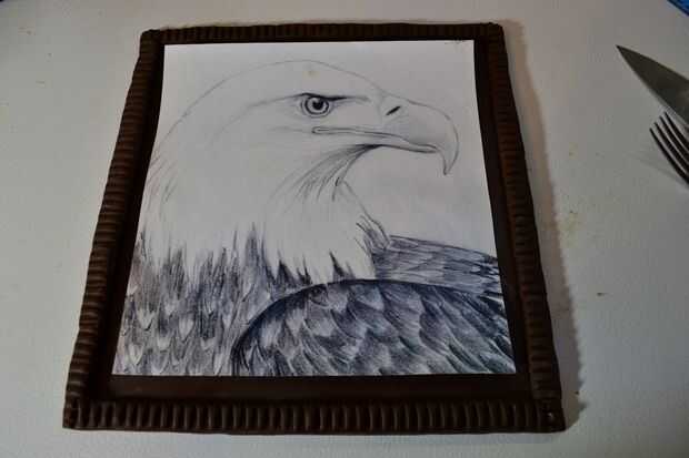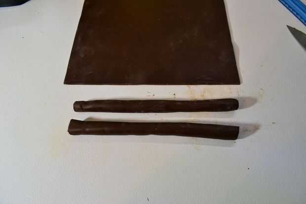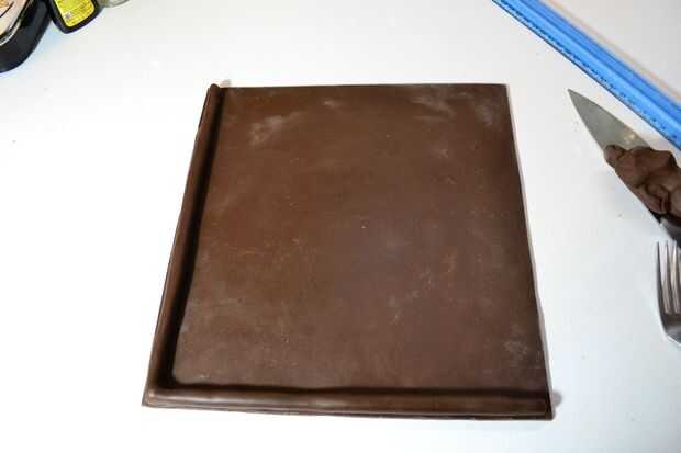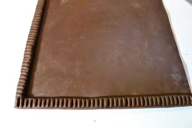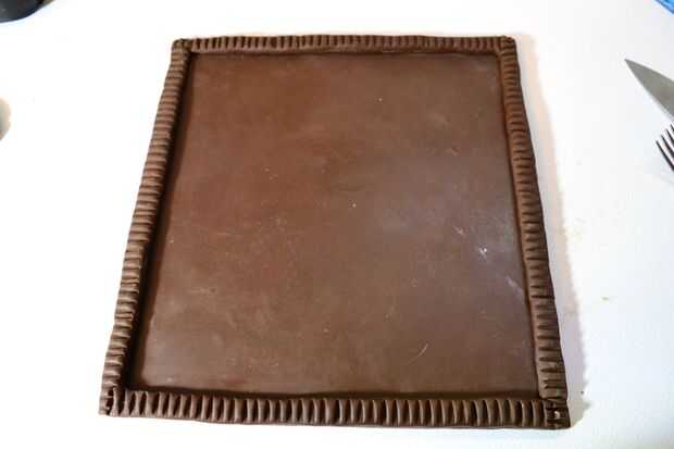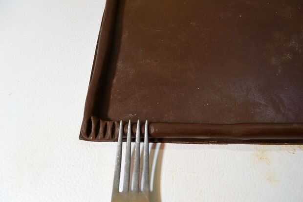 Para el ribete, lanzó el modelado de chocolate finos cilindros y cortar a la longitud necesaria para los bordes del marco. Si la gran plaza ha secado algunos, puede utilizar un poco de agua para pegar los bordes. Para darle cierta textura, usé un tenedor para crear líneas en los bordes. Los diseños posibles para los bordes están limitados sólo por tu creatividad.