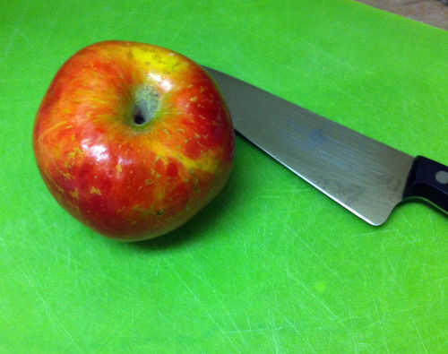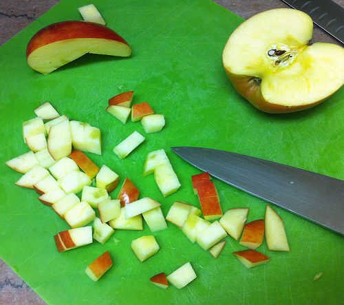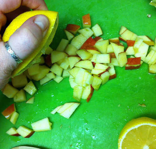 Usé las manzanas fuji porque son lo que tenemos y me gustan cocidas o crudas. Mis manzanas eran grandes, y la mitad de una manzana fue suficiente para que dos postres. He dejado la piel sobre, pero usted puede pelar las manzanas si lo prefiere. Espolvorear sobre el jugo de limón.