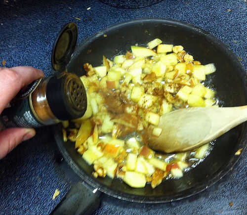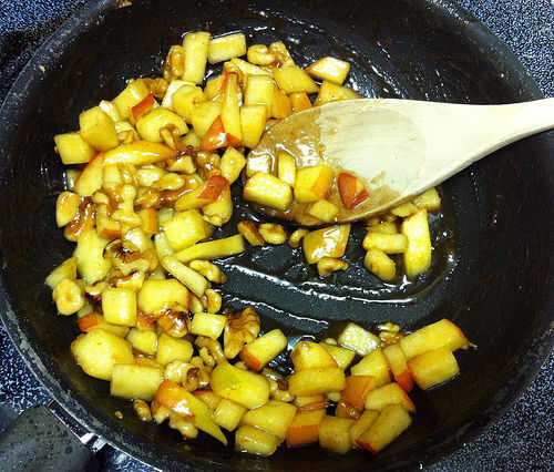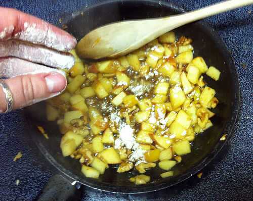 Añadir las manzanas y la miel a la sartén. Revolver, cocinar suavemente hasta que estén casi como hecho como usted tiene gusto. No me gustan las manzanas blandas, cocción excesivamente cocinadas. Añadir la canela y espolvoree un poco de harina. Revolver rápidamente, asegurándose de que la harina no forma cualquier terrón. Cocine hasta que la harina absorbe el exceso de líquido y complica todo. Asegúrese de que la mezcla está burbujeando caliente así que nada de la harina queda cruda.