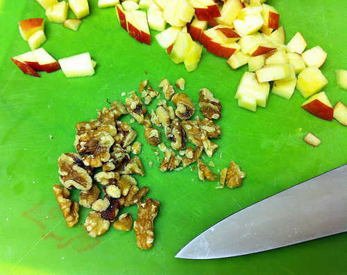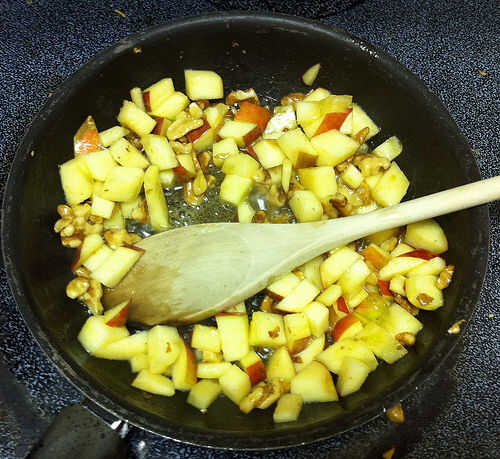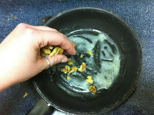 Picar la manzana en pequeños trozos. Derretir la mantequilla en una sartén a fuego medio y agregar las nueces. Revolver de vez en cuando, les tostado hasta que el olor fragante y nuez. No quemarlos.