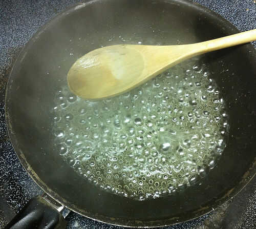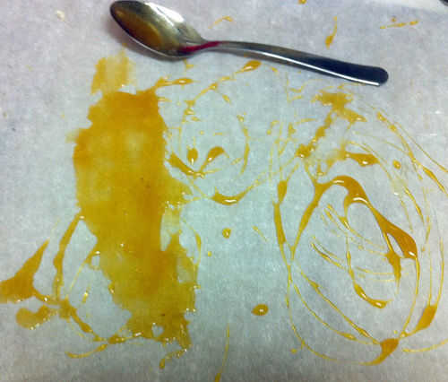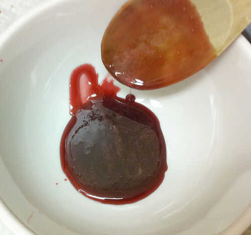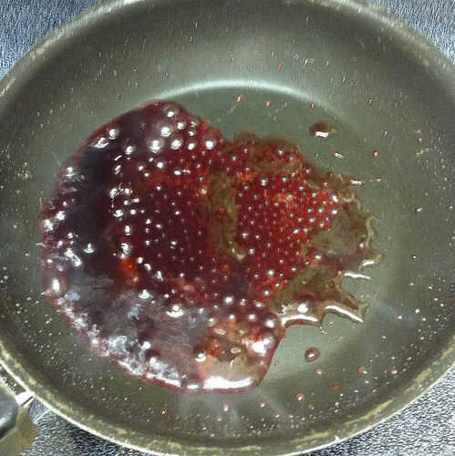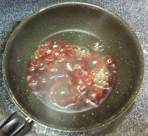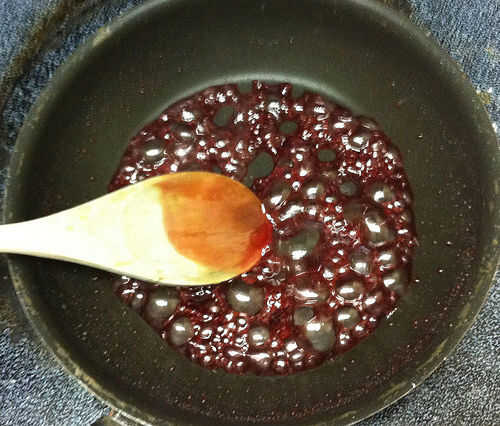 Calentar el siguiente lote de azúcar, jarabe de maíz y agua en la bandeja hasta que llega también al luz color ámbar. Tire de la bandeja del quemador y volcado en el jugo de arándano rojo. Revuelva bien hasta que se mezcle bien. Volver la sartén al calor si desea la salsa más gruesa. Hice mío relativamente gruesa, pero no tienes que dejar como cantidad de agua se evaporan si desea sólo una fina salsa a lloviznar. Si la salsa es demasiado espesa, puede agregar agua y calentar suavemente, mezclando hasta que se combina. Recuerda que el caramelo se endurece considerablemente mientras que se refresca.