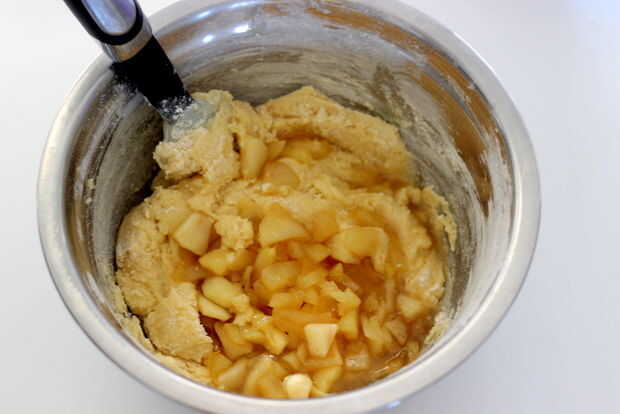 Doble manzanas acarameladas a la masa para la masa húmeda y pegajosa. Una vez hecho lugar la masa en un molde engrasado y poner en el horno. El pan debe hornear durante una hora y veinte minutos (tengo un molde flaco así tarda más en cocer, si tu molde es más ancha que la mía que no tardar tanto) o pegue una selección de diente en el medio. Si sale limpio el pan está hecho. Dejar enfriar completamente. Una vez frío sacar del molde y servir.