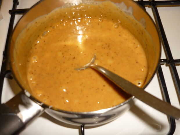 Cuando esto se hace, subir el calor. Usted tendrá que remover continuamente. El azúcar rápidamente se pega a la sartén y luego quemarle. Por esta razón utilizo una cuchara de metal para chatarra realmente el azúcar de la sartén. No hace un ruido muy agradable! Desea que la mezcla hierva. Va a estar muy caliente ya que es una mezcla de azúcar fundido, así que cuidado!