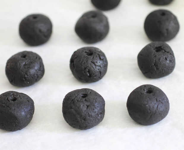 Pop las trufas sobre una bandeja forrada pergamino. Uno de la marca de palos de paleta utilizando un orificio en la parte superior de la trufa, donde se sentará el palillo del lollipop. Esto es en caso de que la mezcla se enfría demasiado durante el proceso de refrigeración. Ver la imagen por ejemplo de colocación del agujero.