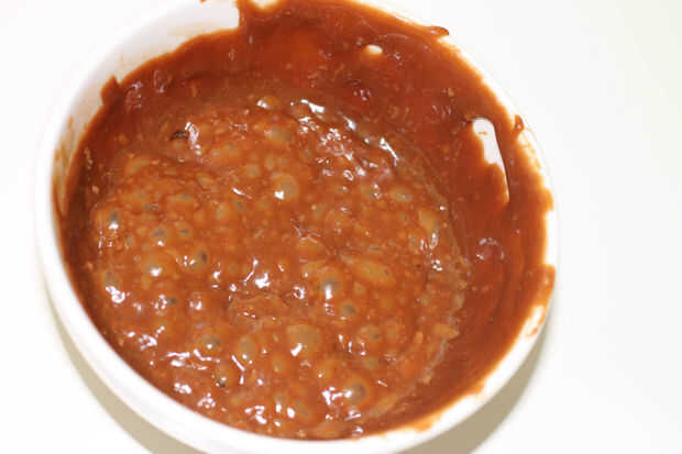 Permita que cualquier mezcla exceso gotee apagado mientras lo sostiene sobre el tazón.