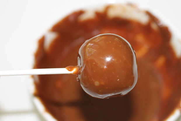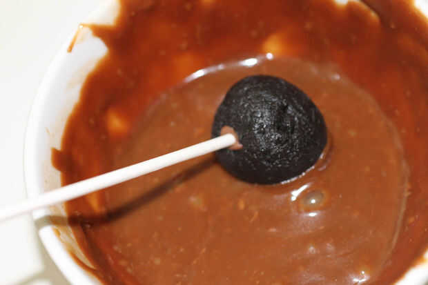 Sosteniendo el extremo del palillo del lollipop cuidadosamente sumerja cada pop de la trufa de Oreo en la mezcla de caramelo asegurando el pop todo está cubierto. Puede ser más fácil sumergir el pop de trufa de Oreo en el recipiente y utilice una cuchara para cubrir la parte superior cerca del palillo del lollipop.
