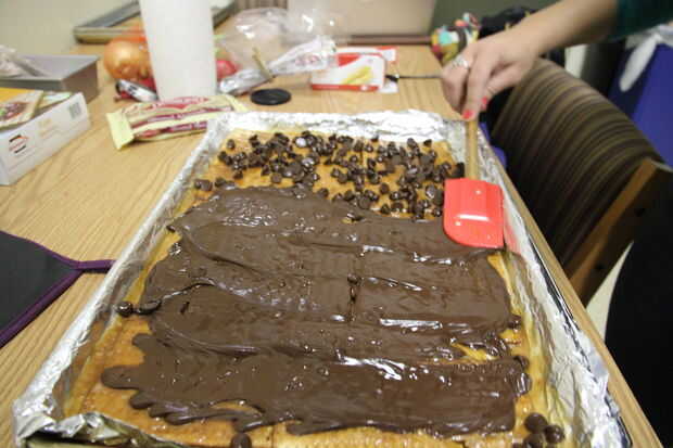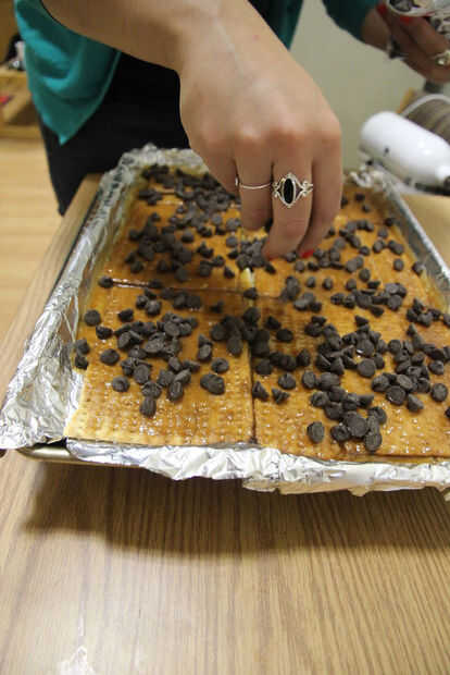 Una vez el matzo y el caramelo en el horno, sácalo y espolvorear inmediatamente en las virutas de chocolate, distribuyendo uniformemente. Permítales sentarse para derretir en el caramelo caliente por unos minutos, entonces extienda el chocolate con una espátula. Cuando aún está derretido el chocolate, añadir la almendra o las nueces (si se desea).