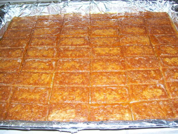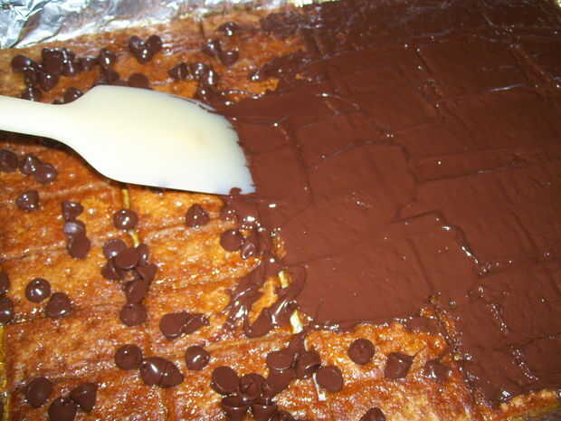 Espolvorear con las virutas de chocolate. Espere unos 2 minutos para los chips derretir, luego extienda el chocolate derretido en una capa uniforme.