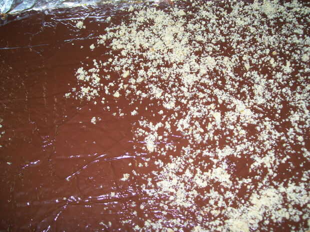 A continuación, Rocíe uniformemente las nueces picadas sobre el chocolate aún fundido. Permite sentarse hasta que totalmente fresco y chocolate se ha solidificado.