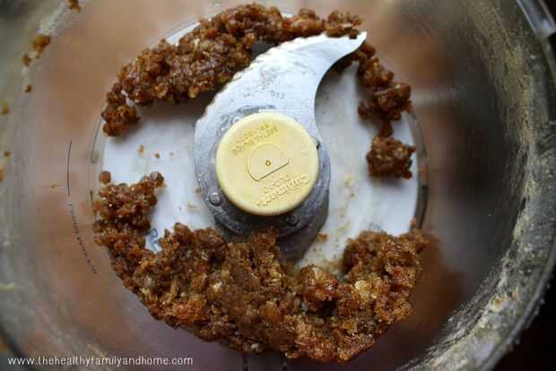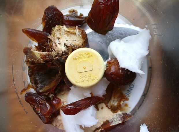 Ponga todos los ingredientes para el caramelo (las fechas medjool, aceite de coco, maca en polvo y vainilla en polvo) en un procesador de alimentos y el proceso hasta que se combina bien.