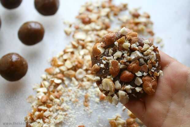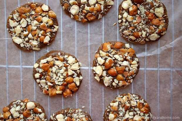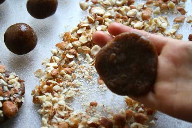 Presionar los discos en las avellanas machacadas, asegurándose de que están completamente cubiertos de avellanas. Rellene los espacios vacíos con avellanas con la mano.