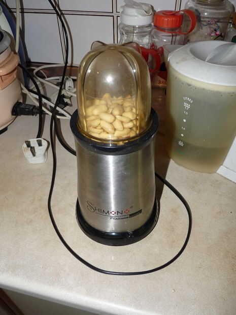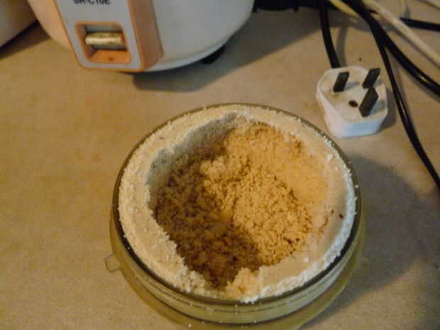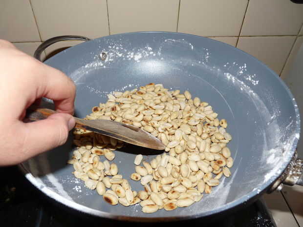 El siguiente es para secar ase los cacahuetes en la misma sartén hasta que esté cocido. Una vez que se realiza sólo la tirada en un procesador de alimentos, licuadora o incluso cortar con un cuchillo. Quiere picar fino y no convertirlo en polvo o polvo como yo lo hice. Pero incluso si usted no afecta el sabor, sería efecto de la textura del producto acabado aunque.